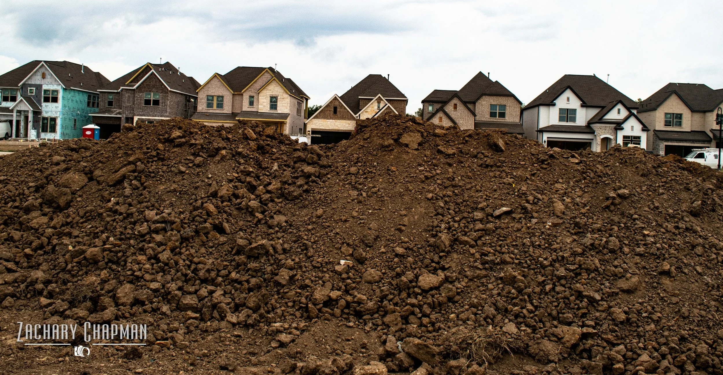 A Housing Development that is one of many in the last few years that has popped up in recent years. Here a large mound of soil, churned up sediment, and large chunks in front of newly constructed houses in progress.