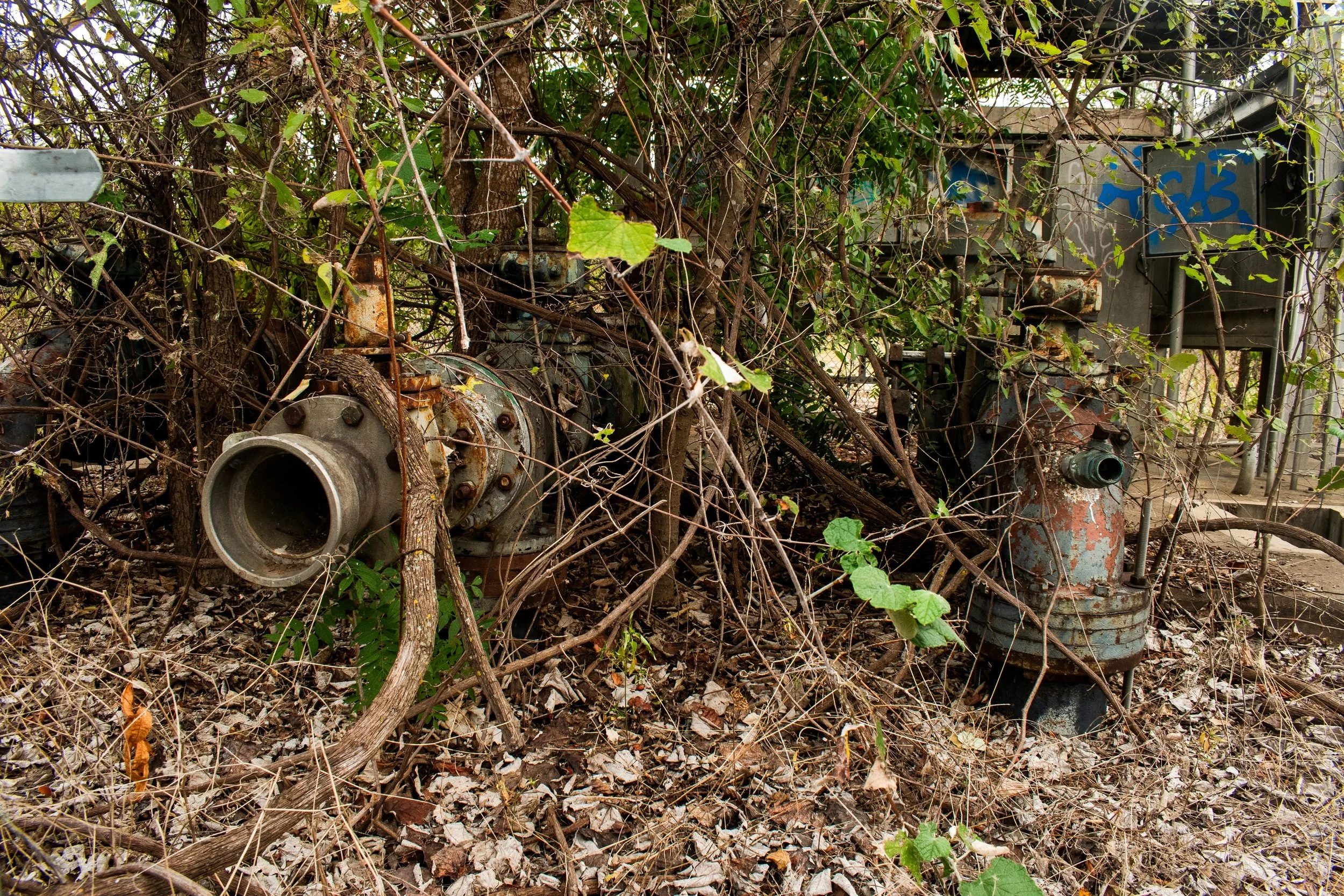 This image depicts an overgrown abandoned pumpstation. This happens to be at a favorite birding site. We see here a series of pipes, a large fixture with graffiti, and a few other components to the old pump. This is at the Village Creek Drying Beds and place that has become a birders paradise.